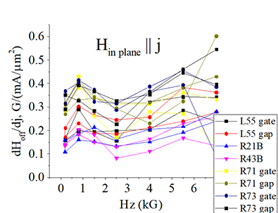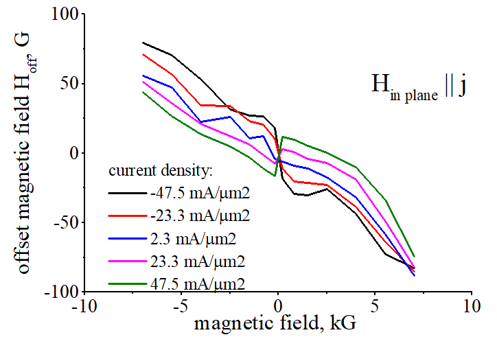 Spin-orbit torque (SOT). Measurement of dependence of anisotropy field Hanis and offset magnetic field Hoff on the electrical current j. |
