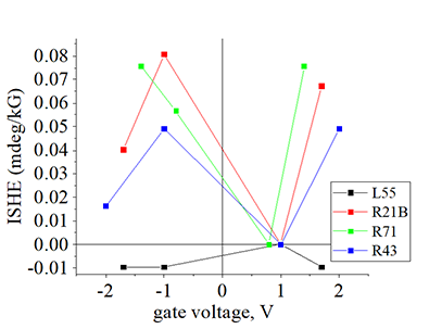 (ISHE vs Vgate ): moderate 0.7 mdeg/kG; slope: negative; saturation: = Vgate=+1 V