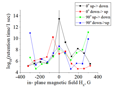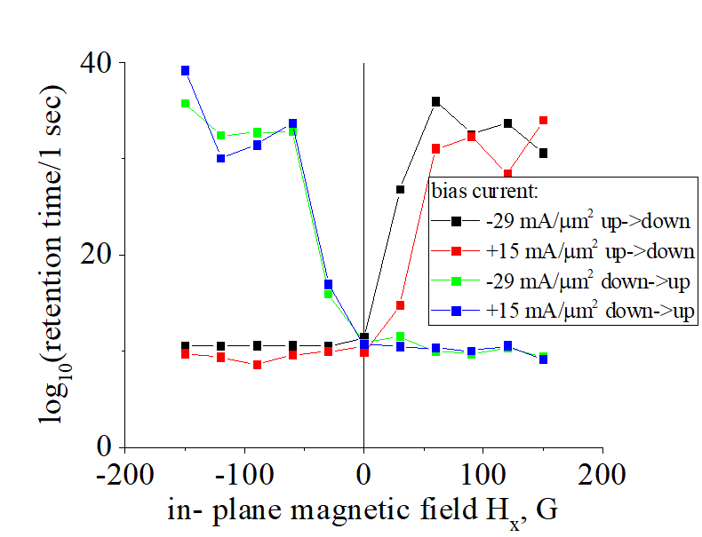 All parameters of thermo-activated switching (e.g. coercive field, retention time, parameter delta, size of nucleation domain) change substantially under external in-plane magnetic field Hx. There are several mechanisms for such change