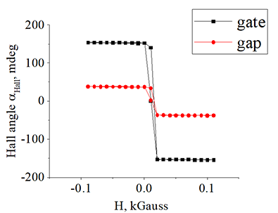 αISHE,0.5= 1024 mdeg; αAHE,0.5= 262 mdeg; αOHE=0.2 mdeg/kG; Hp=3.53 kG;