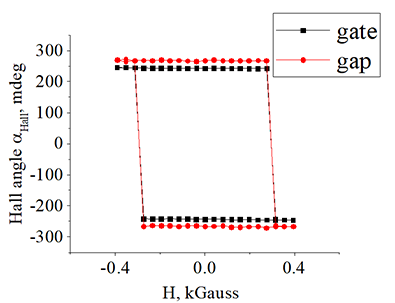 αISHE,0.5= 142.9 mdeg; αAHE,0.5= 2278.78 mdeg; αOHE=0.2 mdeg/kG; Hp=12.26 kG;