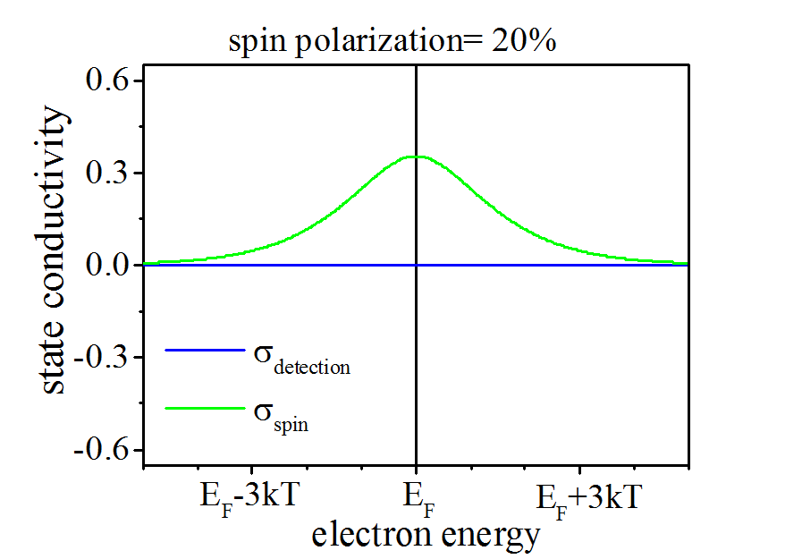 The charge or ordinary conductivity σcharge significantly depends on electron energy. The electrons at the Fermi energy are most effective for the transport of the charge. The ordinary charge conductivity for them is largest. Above and below the Fermi energy the ordinary conductivity sharply decreases. For example, the contribution to the ordinary conductivity of electrons at energies 5kT above/below the Fermi energy is near 50 times smaller than the contribution of electrons at the Fermi energy. It is the primary reason why the conductivity of a metal is much higher than the conductivity of a semiconductor. The ordinary conductivity σcharge does not depend on the spin polarization sp of the electron gas.