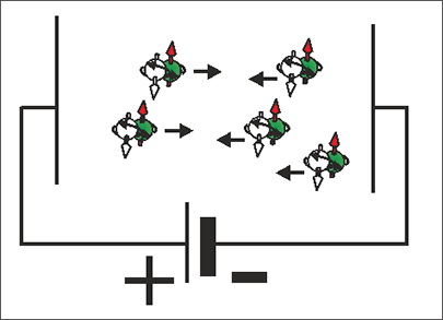 The standing -wave electrons do not contribute to the band current!!When bouncing between defects, one electron, which moves forward, is firmly fixed to the electron, which moves backward. These coupled electrons do not move along crystal. Click on image to enlarge it |