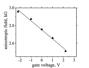 2) The polarity of effect is the same as the polarity of the capacitor effect. The coercive field, the Hall angle, the anisotropy field, all increase under a negative gate voltage and decrease under a positive gate voltage.