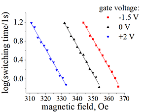 Figure 11 (left) shows the dependence of the switching time on the magnitude of an external perpendicular magnetic field. On a logarithmic scale, the switching time is linearly proportional to the magnetic field. Therefore, the magnetization switching is well described by the Arrhenius law (Details see here) even in the case when magnetic properties are changed by a gate voltage. The switching time becomes longer at a negative gate voltage and shorter at a positive gate voltage. From this Eq, the slope of the lines is proportional to Meff and the horizontal offset is proportional to retention time and consequently to EPMA. Figure 11 (center) shows the measured dependence of the retention time on the gate voltage. On a logarithmic scale, the dependence is linear. The retention time increases at a negative gate voltage and decreases at a positive gate voltage. As can be seen from Fig. 11(left), the slope for each line is nearly the same. It means that the Meff is not significantly affected by the gate voltage. The Meff describes the average bulk magnetization during the magnetization reversal. It is not sensitive to a small change of magnetization in a thin region near the interface. Figure 11(right) shows the measured dependence of the Δ on the gate voltage. The dependence is linear. The Δ increases at a negative gate voltage and decreases at a positive gate voltage.