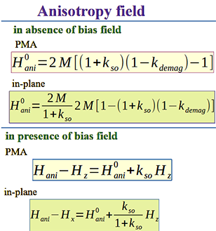 where M is magnetization (~14 kGauss for FeB); Hani is the anisotropy field (~2-10 kGauss for FeB); and Hext are in-plane and perpendicular-to-plane of applied external magnetic field.