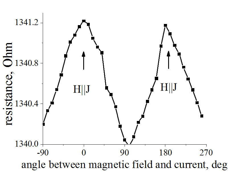 The resistance of FeB wire as function the angle between applied magnetic field and the direction of electrical current in the wire. 0 and 180 deg correspond to the case when magnetic field is along the wire. -90 and 90 deg correspond to the case when magnetic field is perpendicular to the wire and in film plane. AMR is about 0.09%. Important! The resistance becomes larger when the magnetic field is applied along the wire. This polarity of AMR is the same for the most of metal only with a few exceptions of some monocrystal metals. Sample Hall 16. Measured on 2016/02/29 |