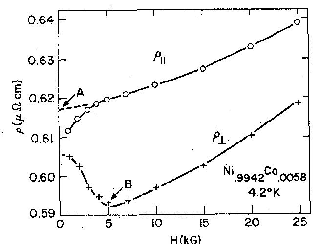 As can be seen from Eq.2.8, the experimentally observed AMR is opposite to that expected from two consequent Hall effects. When magnetization is perpendicular to the current, there is Hall effect, two 90 deg rotations makes the 2nd Hall current flowing opposite to the main current and therefore the resistance should increase. Experimentally observed dependence is opposite (See Fig.), the resistance is largest when the magnetization is parallel to the current.