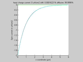 In all examples, the animated parameter is the input charge current (shown on the top of the figures). Also, on the top of each figure a ratio of the drift and diffussion spin currents is shown. The x-coordinate is the diffusion distance. For comparison the green plot shows a spin transport in the case if the conductivity of the semiconductor would be not spin-dependent (beta=0).