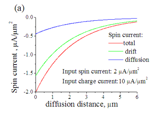 Figure 2(a) shows the diffusion spin current, the drift spin current and their sum for the case when the drift current flows along the direction of the diffusion current. The polarity of the drift and diffusion spin currents are the same and the magnitude of each current is smaller than the magnitude of total spin current. Figure 2(b) shows the diffusion spin current, the spin-current component of the drift current and their sum for the case when the drift and diffusion currents flow in opposite directions. The polarities of the drift and diffusion spin currents are opposite and the magnitudes of both diffusion and spin currents are substantially larger than the magnitude of the total spin current.