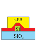 A negative thick EB resist is used ( resist thickness ~ 100 nm) . A negative resist means that parts, which was exposed to the EB beam, is not etched. Si nanowire waveguide width is 450 nm. The width of the spot-size converter is 150 nm. The width of Si-bridge of plasmonic part is 50 nm (70 nm is also OK).
