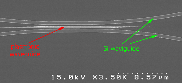 In this case the plasmonic waveguides is integrated aside of a Si waveguide and the direct propagation of light is not blocked in Si waveguide. Only a resonance coupling in/out of a plasmonic waveguide only affects the output. It is similar to a ring resonator, where a ring is fabricated aside of a straight Si waveguide.