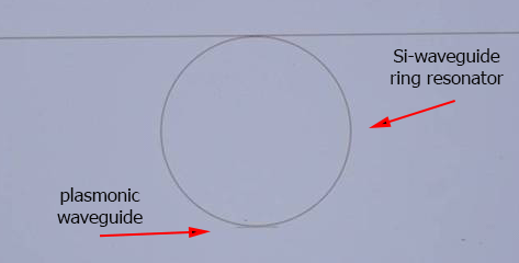 Under the ring of Si-waveguide-made ring resonator, there is a magneto-optical plasmonic waveguide. The resonance wavelength can be changed by reversing the magnetic field or by reversing light propagation direction (exchange the output and input) |