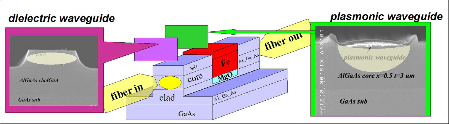Fig.3 Plasmonic waveguide Fe/MgO/AlGaAs integrated with AlGaAs dielectric waveguides. click on image to enlarge it |