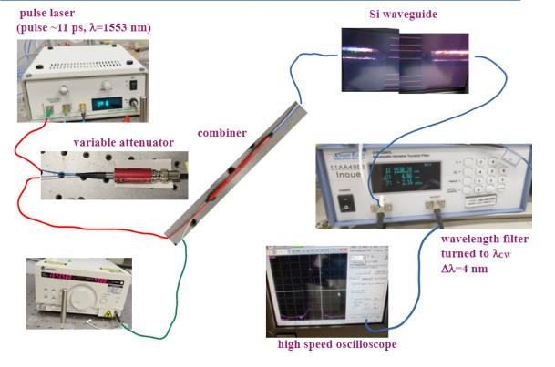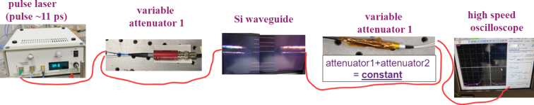 | The key idea of this setup is the use of two synchronized variable attenuators. When the first attenuator increases, the second decreases proportionally, keeping the total attenuation constant. As a result, the pulse intensity entering the Si waveguide can be modulated, while the attenuation on the path to the oscilloscope is fixed. |