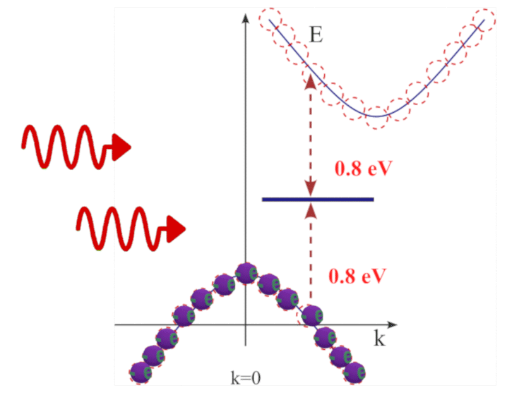 Immediately after being excited to the middle level by the first photon, the electron interacts with a second photon. As a result, the electron is excited to the conduction band. The carrier lifetime in the conduction band is much longer, so there is no emission of a coherent photon. Therefore, photons are effectively removed from the optical field, producing nonlinear absorption. Since this process requires two photons, it manifests as a nonlinear optical effect.