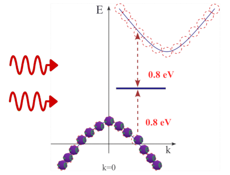 Similar to how a strong static electric field applied to an atom can shift and modify atomic energy levels (Stark effect), a strong oscillating optical field can modify the electronic energy structure in a semiconductor. The combined optical field of many photons can induce quantum states within the bandgap, which are often called field-dressed (or light-field dressed) dynamic states. Electrons from the valence band can be excited into these states, leading to photon loss and thus nonlinear absorption. As the amplitude of the optical field increases, the field-induced modification of the electronic states becomes stronger, the density of these states becomes larger and the probability of such transitions correspondingly increases.