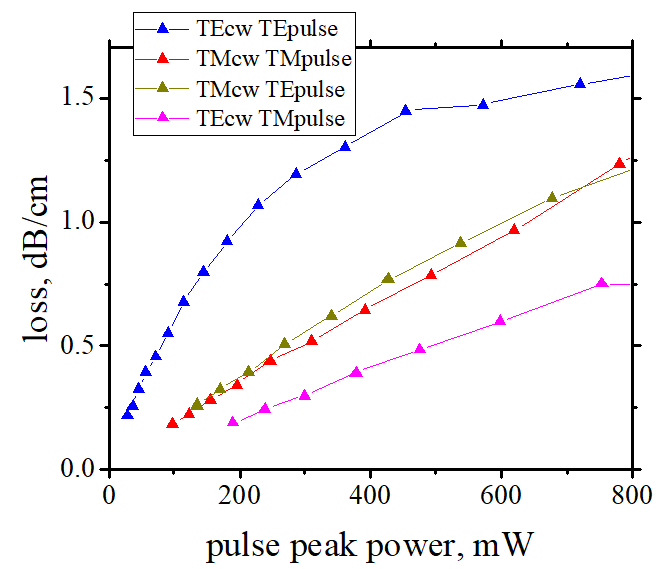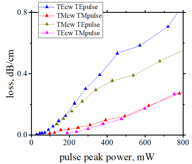 In the classical picture, this loss should be linearly proportional to the pump pulse intensity, since one pump photon is absorbed together with one CW probe photon. Indeed, we observed this linear dependence for almost all pump/probe polarization combinations—except when both pump and probe were TE-polarized. In that case, the absorption saturates at peak powers above 300 mW. Moreover, classical theory predicts that TPA should occur only when the pump and probe have the same polarization. . In contrast, we observed comparable absorption for both co-polarized and cross-polarized configurations.