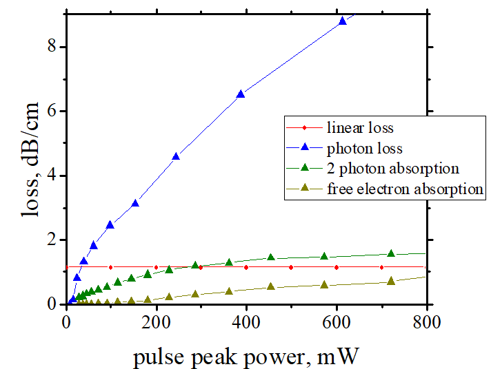 | Linear (red line) and Non- linear (blue and green lines) absorptions in a Si nanowire waveguide | ||||||