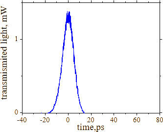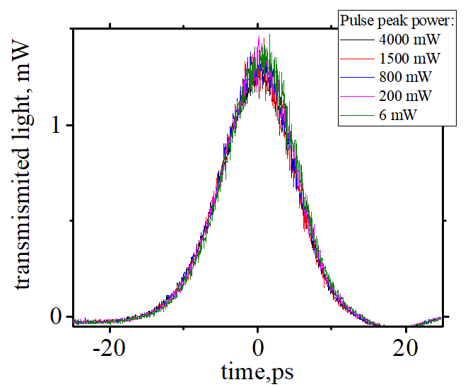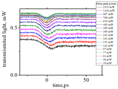 | (minimum peak): the shape of the minimum transmission corresponds to the shape of the pumping pulse. The reduction of transmission is due to two-photon absorption. |