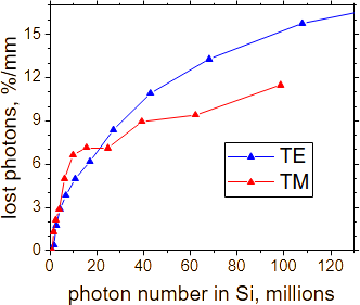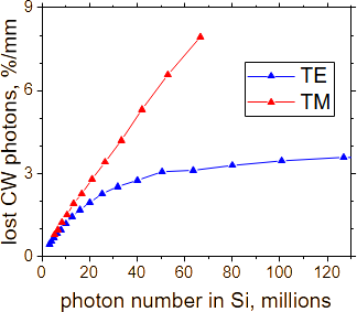 Since the amount of optical power confined in silicon is approximately twice smaller for the TM mode than for the TE mode, the nonlinear loss for the TM mode should be roughly half that of the TE mode.