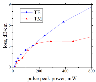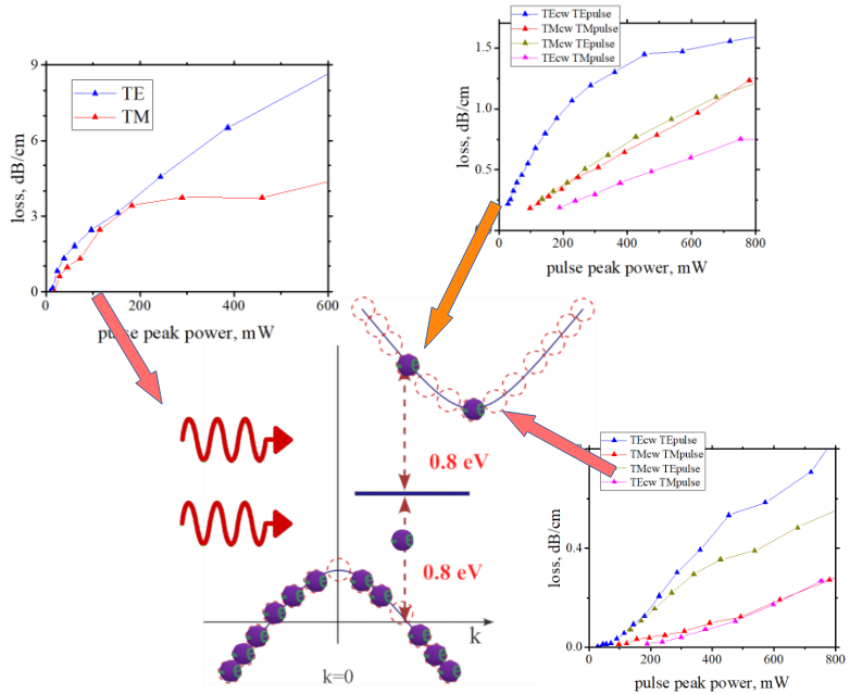 In the classical picture, this loss should be linearly proportional to the pump pulse intensity, since one pump photon is absorbed together with one CW probe photon. Indeed, we observed this linear dependence for almost all pump/probe polarization combinations—except when both pump and probe were TE-polarized. In that case, the absorption saturates at peak powers above 300 mW. Moreover, classical theory predicts that TPA should occur only when the pump and probe have the same polarization. . In contrast, we observed comparable absorption for both co-polarized and cross-polarized configurations.